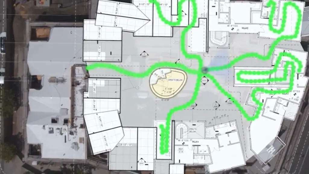 Simultane Ortung und Kartierung (SLAM) ist eine Technik, mit der eine Karte einer unbekannten Umgebung erstellt wird, während man sich gleichzeitig durch sie bewegt. SLAM ist einer der wichtigsten Algorithmen für die Navigation von selbstfahrenden Autos. OpenSpace verwendet bildbasiertes SLAM, um den abgelaufenen Weg auf einem Grundriss zu schätzen, wobei die Algorithmen ständig sequenzielle Daten abgleichen, um Position und Weg zu schätzen.