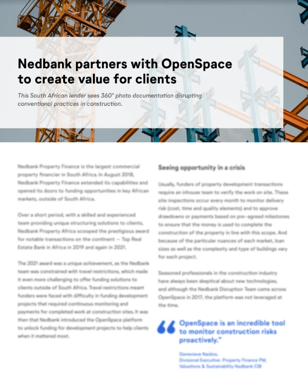 “OpenSpace is an incredible tool to monitor construction risks proactively,” says Genevieve Naidoo, Divisional Executive: Property Finance PM, Valuations & Sustainability Nedbank CIB. “Initially we were concerned about the additional cost of the platform, since property development projects are sensitive to extra costs. But the benefits of OpenSpace far outweigh the cost of the technology in terms of saving time for professional teams. Being able to pay our clients quicker creates a huge benefit for them in managing their cash flow cycles.”